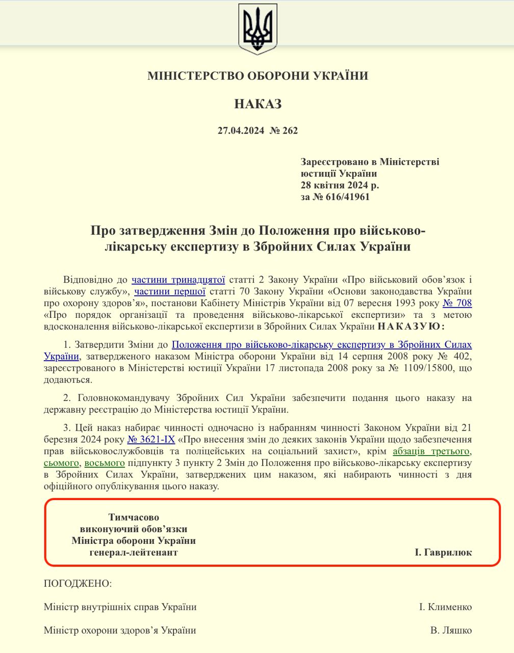 16.02 Украинские паблики обратили внимание, что под приказом Минобороны от 27 апреля с обновленным списком заболеваний, которые определяют пригодность к военной службе, стоит подпись временно исполняющего обязанности министра обороны Гаврилюка, а не министра обороны Умерова.