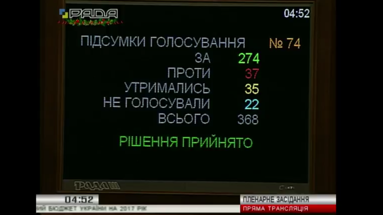Верховная Рада 274 голосами "за" приняла 21 декабря в 4.52 государственный бюджет на 2017 год.