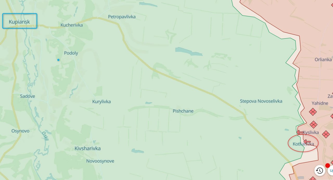 На карте ресурса Deep State треть села обозначена под контролем РФ и до половины - в серой зоне. Котляровка выходит на трассу, которая ведет в Купянск с юга.