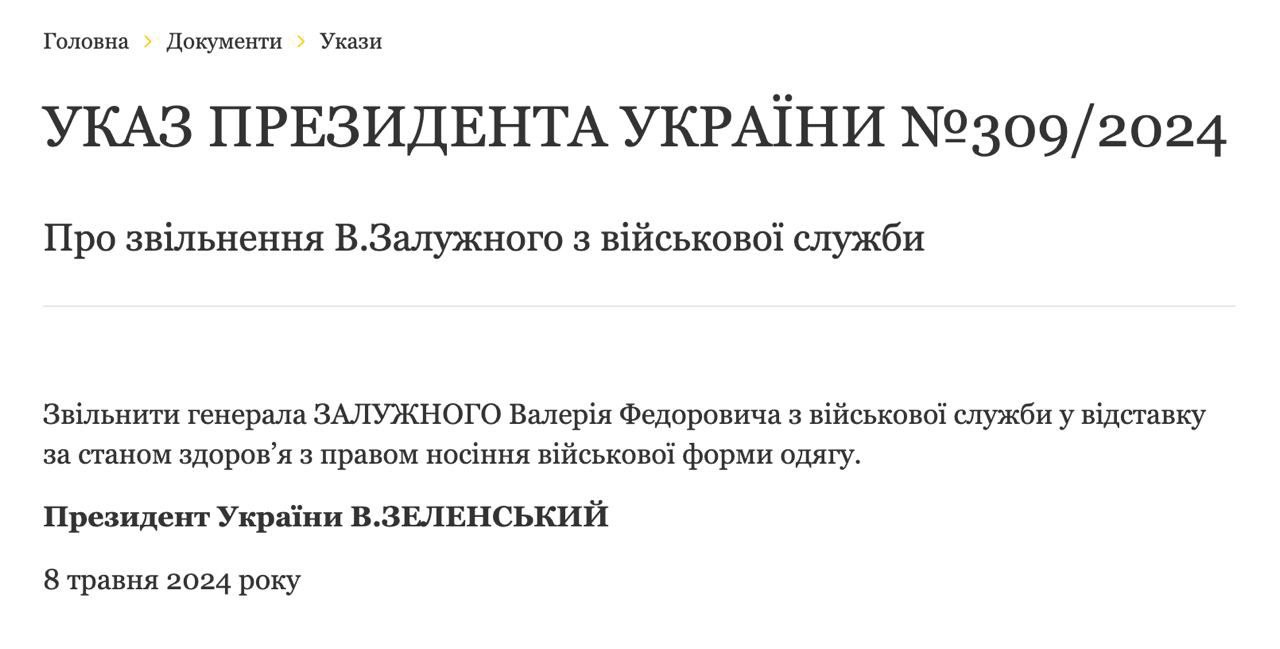 13.42 Залужного официально уволили с военной службы по состоянию здоровья.