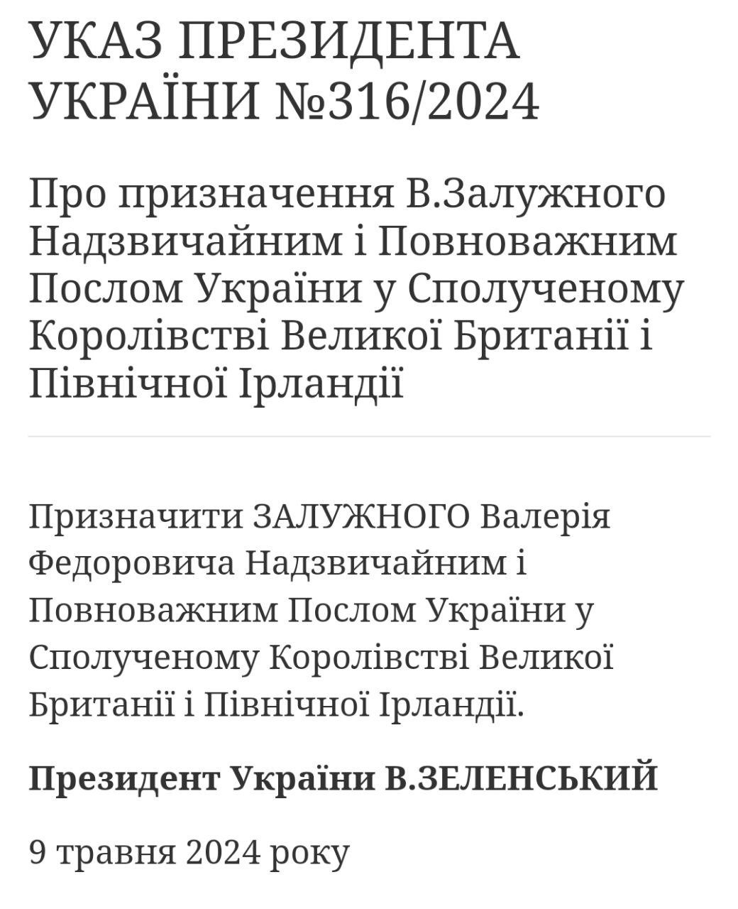 14.08 Экс-главком Залужный официально назначен послом Украины в Британии.