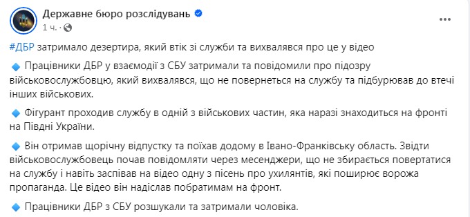Мужчина получил ежегодный отпуск и отправился домой в Ивано-Франковскую область. Оттуда военнослужащий начал писать в мессенджеры, что не собирается возвращаться на службу и даже спел на видео одну из песен об уклонистах. Это видео он послал сослуживцам на фронт.