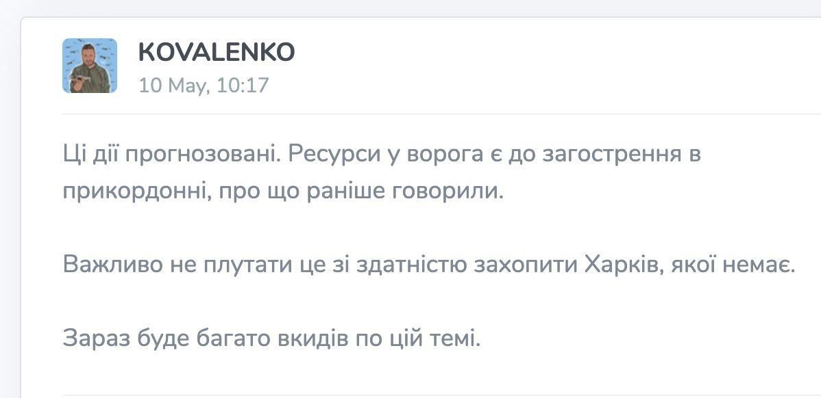 "Эти действия прогнозируемы. Ресурсы у врага есть к обострению в приграничье, о чем ранее говорили. Важно не путать это со способностью захватить Харьков, которой нет. Сейчас будет много вбросов по этой теме", - написал Коваленко.