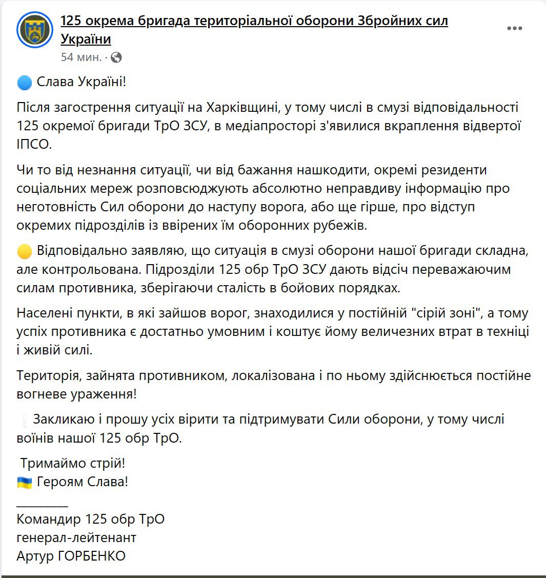 "Ответственно заявляем, что ситуация в полосе обороны бригады сложная, но контролируемая. Подразделения 125-й ОБр ТрО ВСУ дают отпор превосходящим силам противника, сохраняя постоянство в боевых порядках", - сообщило командование бригады.
