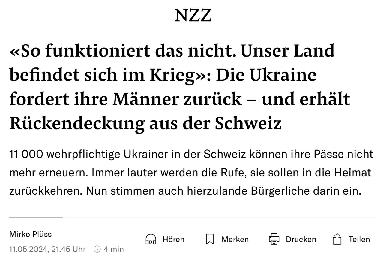 13.27 В Швейцарии отдельные политики призывают помочь Украине вернуть мужчин призывного возраста, пишет Neue Zürcher Zeitung.