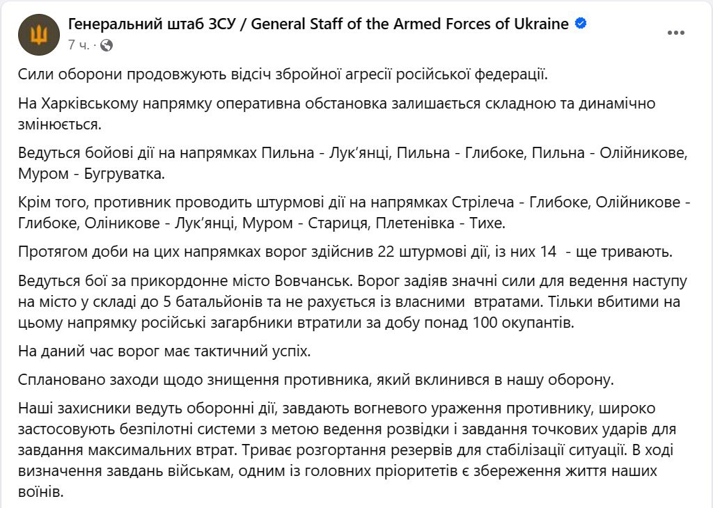 Генеральный штаб ВСУ заявил, что ведутся бои за Волчанск в Харьковской области. Россияне наступают на него силами пяти батальонов.