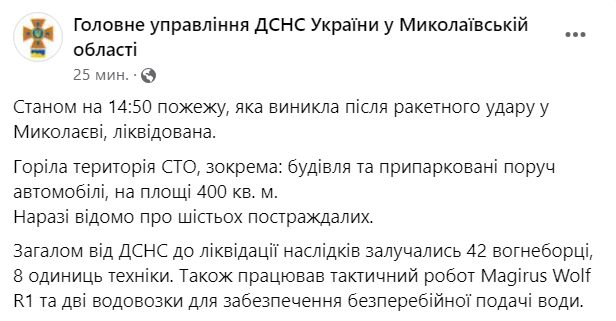 В настоящее время пожар, который возник после ракетного удара в Николаеве, ликвидирован. Известно о шести пострадавших.