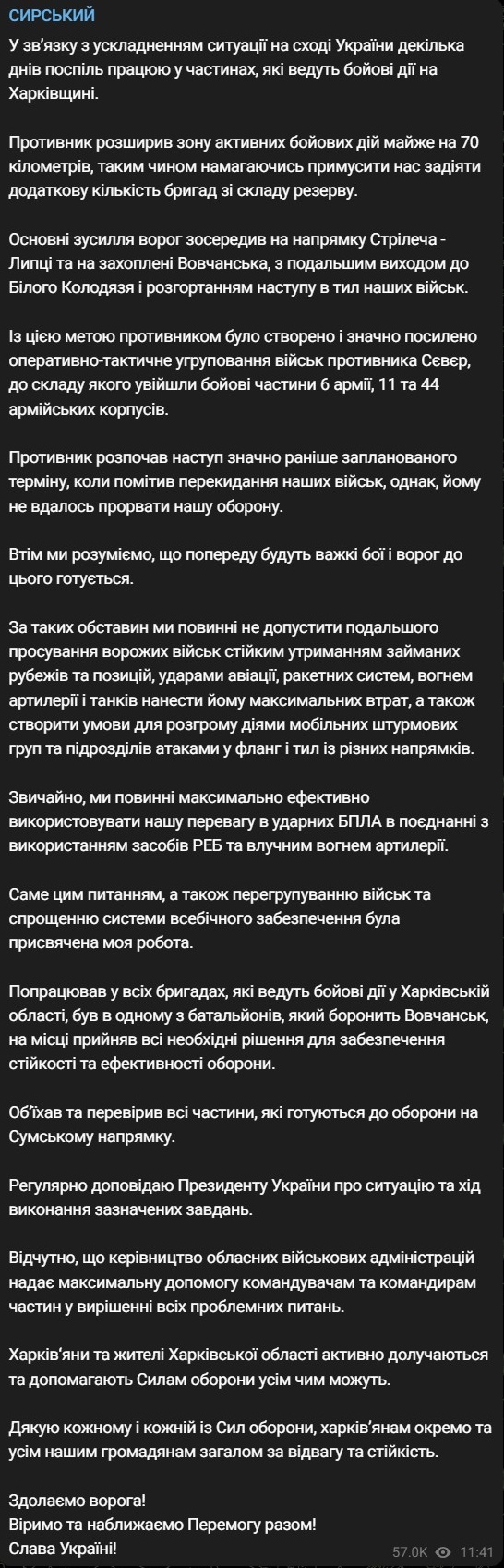 Сырский посетил и Сумскую область, где также ожидается наступление РФ.