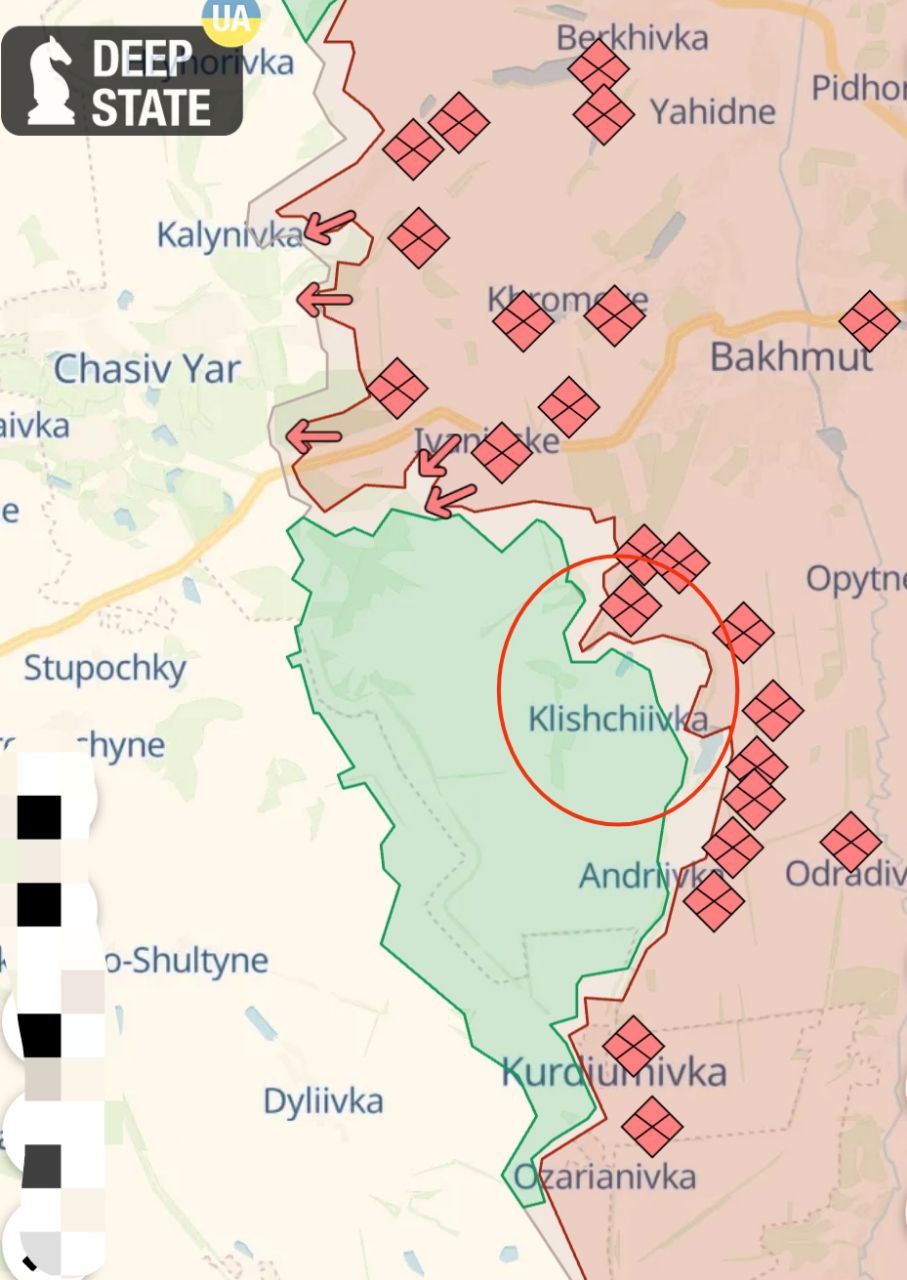 Генштаб ВСУ вчера вечером заявил, что в Клещеевке россияне ведут штурм, который отражается. Часов Яр в общей сводке не упоминался.