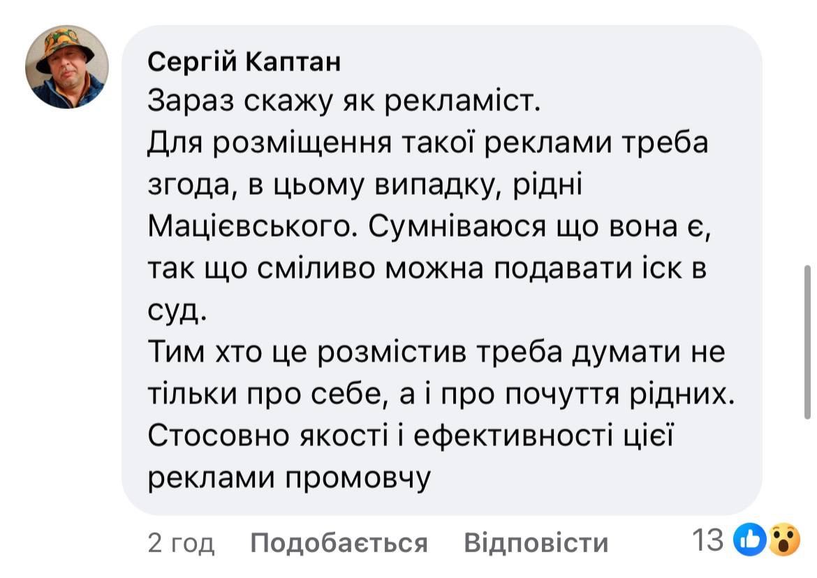 Один из комментаторов отмечает, что, вероятно, для размещения этой рекламы не было получено разрешение семьи Александра Мациевского, из-за чего можно подать иск в суд.