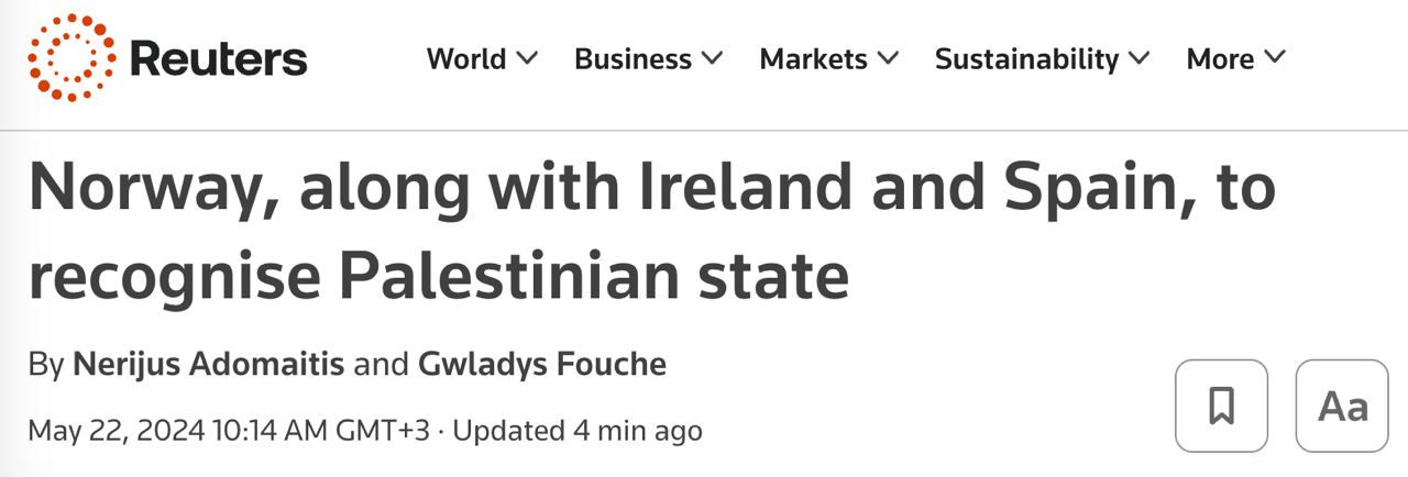 "Сегодня Ирландия, Норвегия и Испания объявляют о признании государства Палестина. В преддверии сегодняшнего объявления я поговорил с рядом других лидеров и коллег и уверен, что в ближайшие недели к нам присоединятся другие страны, которые сделают этот важный шаг", - заявил премьер-министр Ирландии Саймон Харрис.