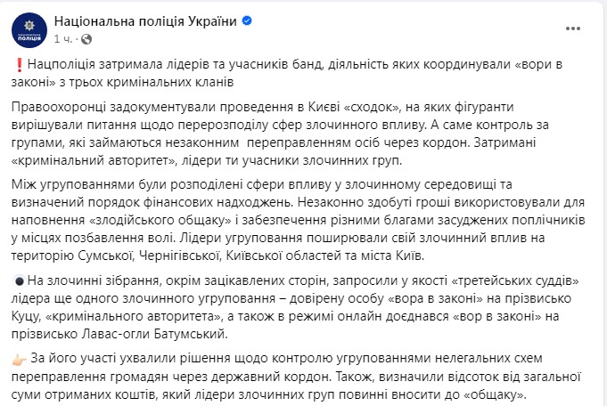 Правоохранители задокументировали проведение в столице нескольких "сходок" трех криминальных кланов, на которых распределяли сферы влияния и финансы, поступившие на территории Киева, Сумской, Черниговской, Киевской областей от помощи в нелегальном выезде из Украины.