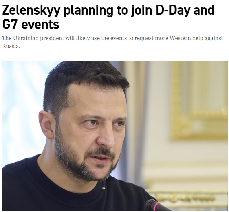 Владимир Зеленский намерен посетить мероприятия в Нормандии в честь 80-летия высадки союзных войск и встречу G7 в Италии, чтобы просить у Запада еще больше оружия, а также призвать НАТО сбивать российские ракеты.