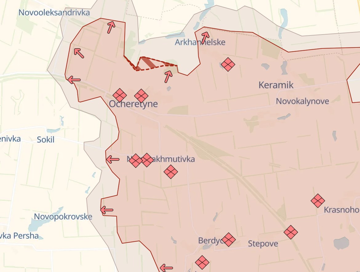 Российские силы за минувшие сутки продвинулись к северо-востоку от Очеретино, пишет военный паблик Deep State. "Институт изучения войны" (США) пишет о продвижении россиян к западу от Бердычей на том же Авдеевском участке.