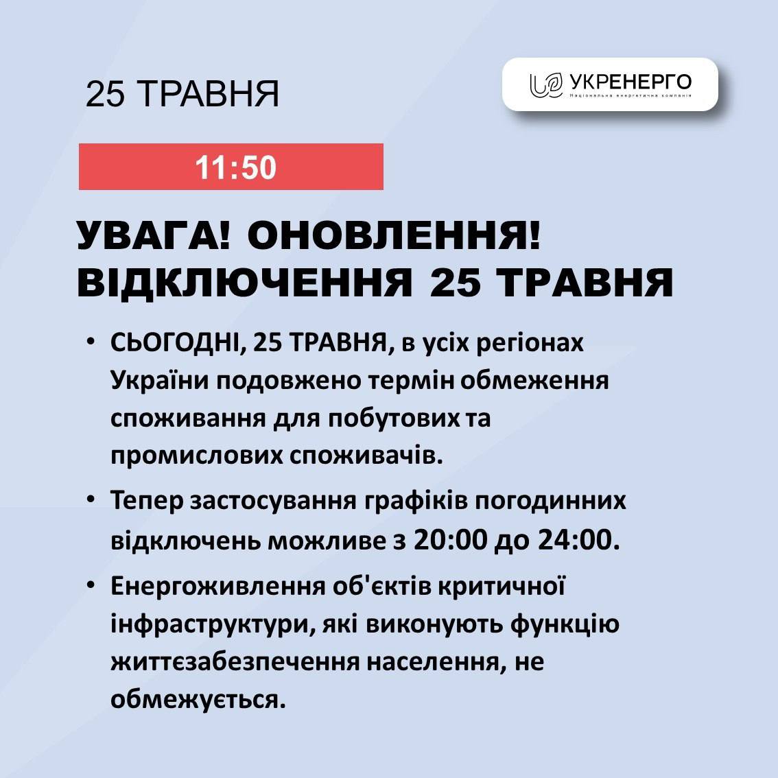 Графики почасовых отключений будут задействована с 20:00 до 24:00.