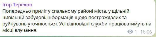 16.23 Прилет в Харькове был в строительный гипермаркет, сообщил Игорь Терехов.