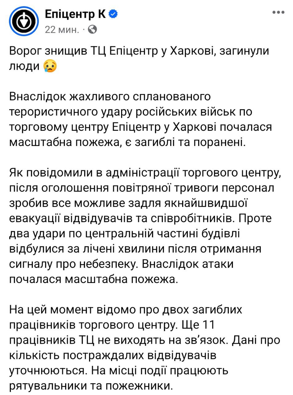 18.21 Губернатор Синегубов заявил, что 25 человек получили ранения в харьковском "Эпицентре", но это не окончательная цифра.