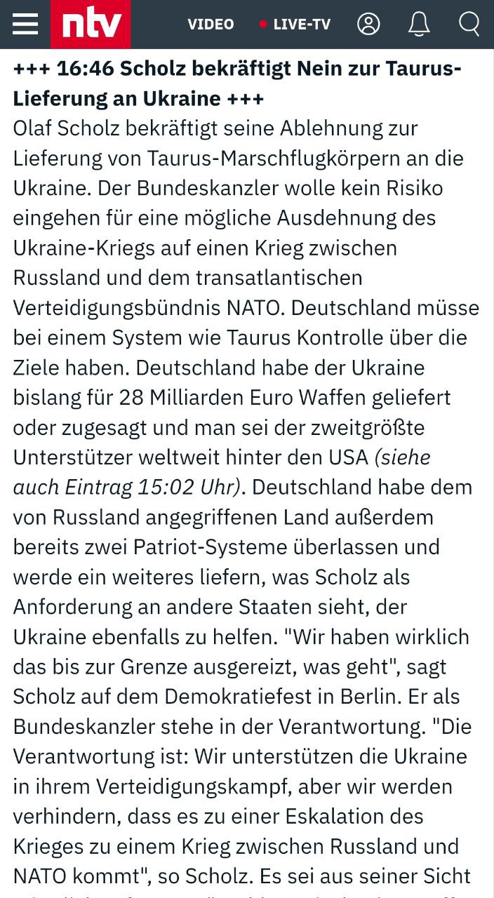 "Ответственность такова: мы поддерживаем Украину в ее оборонительной борьбе, но мы не позволим войне перерасти в войну между Россией и НАТО", - добавил канцлер.