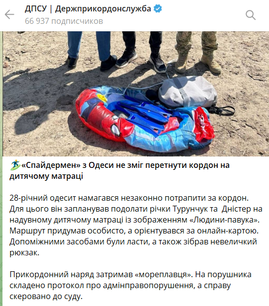 "28-летний одессит пытался незаконно попасть за границу. Для этого он запланировал преодолеть реки Турунчук и Днестр на надувном детском матрасе с изображением "Человека-паука". Маршрут придумал лично, а ориентировался по онлайн-карте. Вспомогательными средствами были ласты и также он собрал небольшой рюкзак. Пограничный наряд задержал "мореплавателя". На нарушителя составлен протокол об админправонарушении, а дело направлено в суд", – сообщают пограничники.
