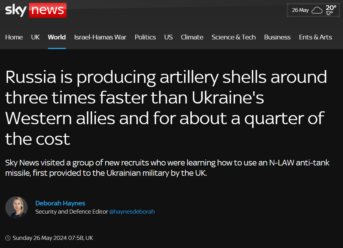 РФ производит артиллерийские снаряды примерно в три раза быстрее, чем западные союзники Украины - Sky News