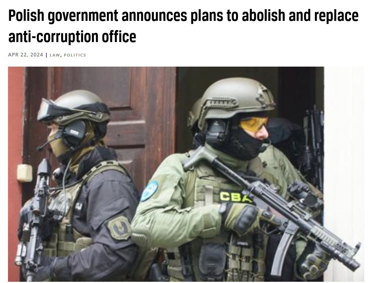 Правительство Польши объявило о планах упразднить местный аналог НАБУ - Центральное антикоррупционное бюро (CBA), которое существовало почти 20 лет. Его хотят заменить новым учреждением – Центральным бюро по борьбе с коррупцией. Законопроект об этом уже на стадии подготовки.