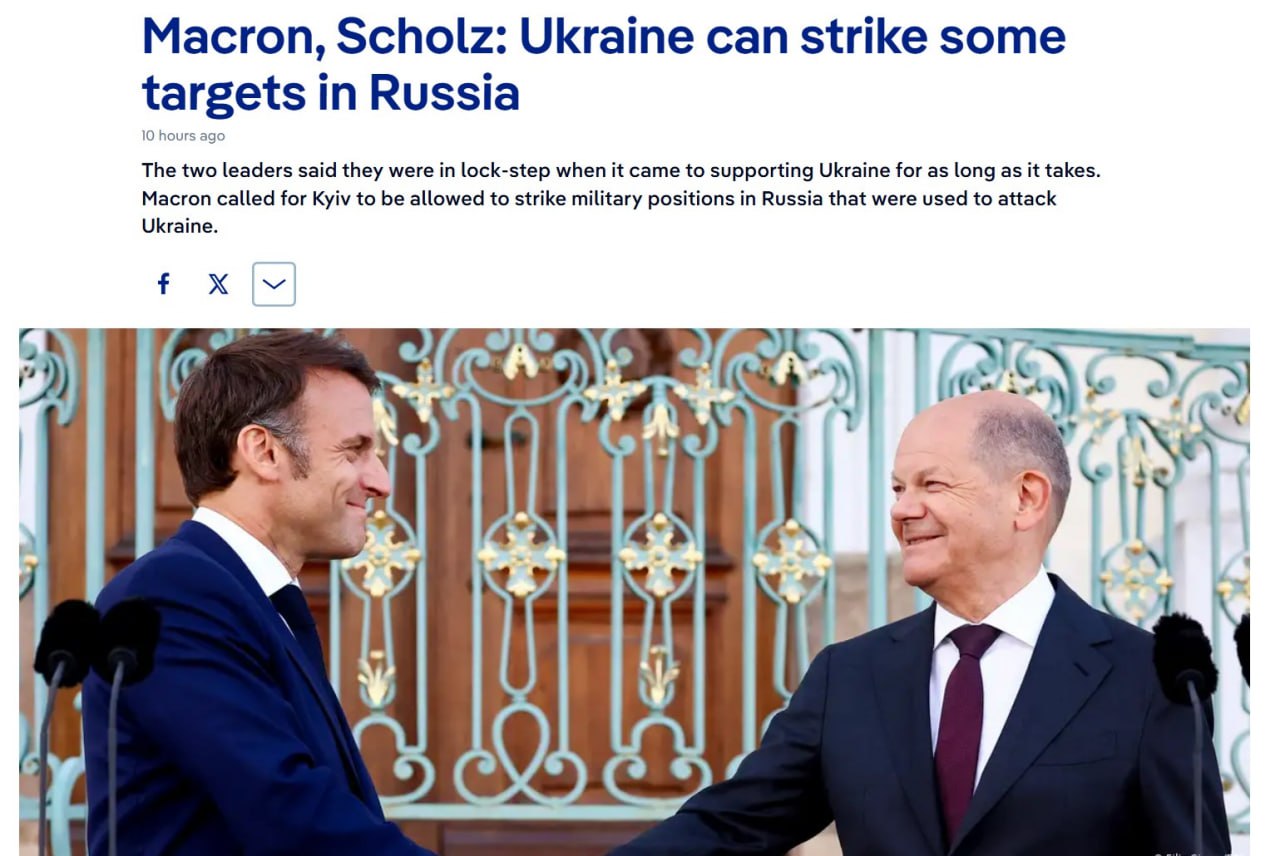 Британская The Guardian пишет, что канцлер Германии, "похоже, также поддержал Украину в этом вопросе, заявив, что он согласен с президентом Франции при условии, что украинцы будут уважать условия поставщиков оружия".