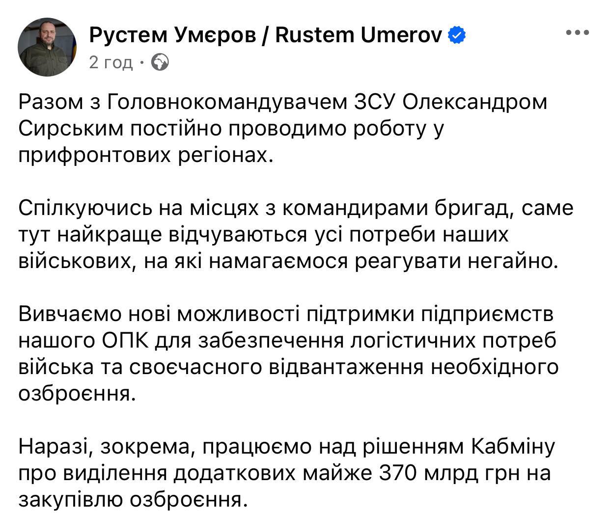20:10 Минобороны работает над решение Кабмина о выделении дополнительных 370 млрд грн на закупку вооружения.