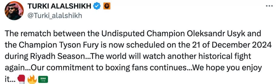 Об этом заявил в соцсети Х организатор боя, глава генуправления Саудовской Аравии по развлечениям.