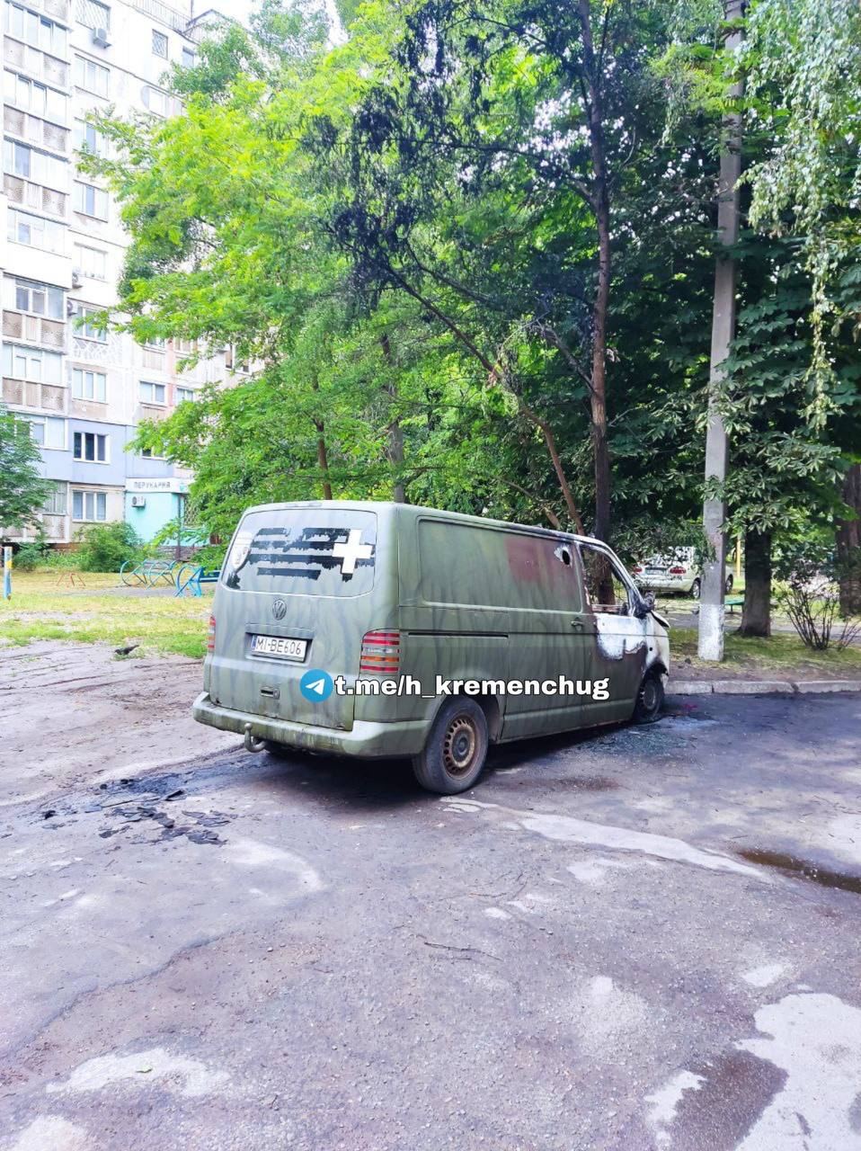 В Кременчуге местные паблики пишут, что ночью сожгли припаркованный бус защитного цвета с белым крестом - неофициальным знаком отличия ВСУ.