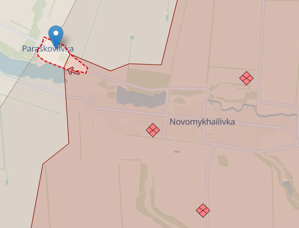 Паблик Deep State показывает, что вся территория села находится в серой зоне. Штурм Парасковиевки начался после захвата Новомихайловки. Здесь главное направление удара - находящееся к западу село Константиновка. Если его возьмут россияне, создастся угроза их захода в тыл группировке украинских войск в районе Угледара, а также в целом расширится фронт наступления армии РФ к югу от Донецка.