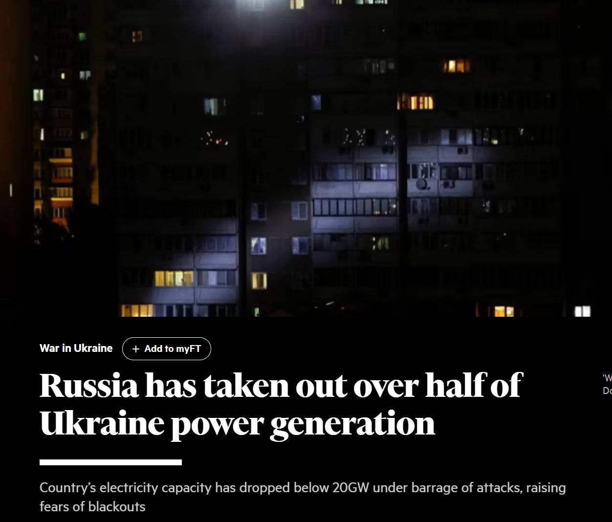 В целом Россия вывела из строя или захватила более половины украинских электростанций, пишет FT.