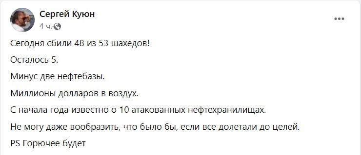 "Сегодня сбили 48 из 53 "Шахедов"! Осталось 5. Минус две нефтебазы. Миллионы долларов в воздух. С начала года известно о 10 атакованных нефтехранилищах", – написал Куюн.