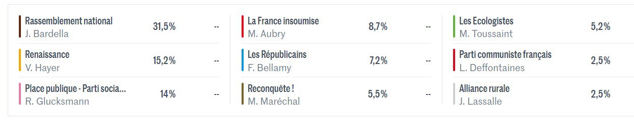 Лидер "Нацобъединения" Жордан Барделла по итогам выборов в Европарламент призвал Макрона ко внеочередным выборам в парламент страны, так как нынешний его состав (где у Макрона большинство) "не отражает волю народа".