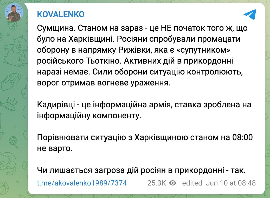 "Активных действий в приграничье пока нет. Силы обороны ситуацию контролируют, враг получил огневое поражение. Остается ли угроза действий россиян в приграничье - да", - пишет Коваленко.