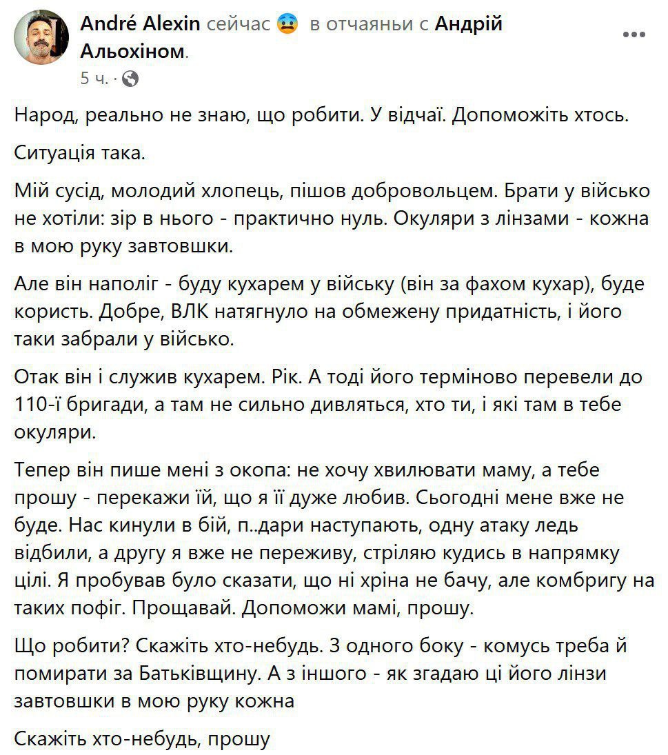 "Мой сосед, молодой парень, пошел добровольцем. Брать в армию не хотели: зрение у него – практически ноль. Очки с линзами – каждая в мою руку толщиной. Но он настоял – буду поваром в войске (он по специальности повар), будет польза. Благо, ВВК натянуло на ограниченную пригодность, и его забрали в армию. Так он и служил поваром. Год. А тогда его срочно перевели в 110-ю бригаду, а там не сильно смотрят, кто ты, и какие там у тебя очки", – написал Алехин.