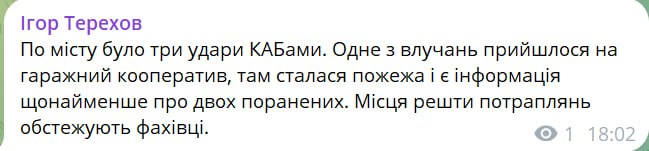 18:06 Мэр Харькова сообщает о трех прилетах корректируемых авиабомб в город.