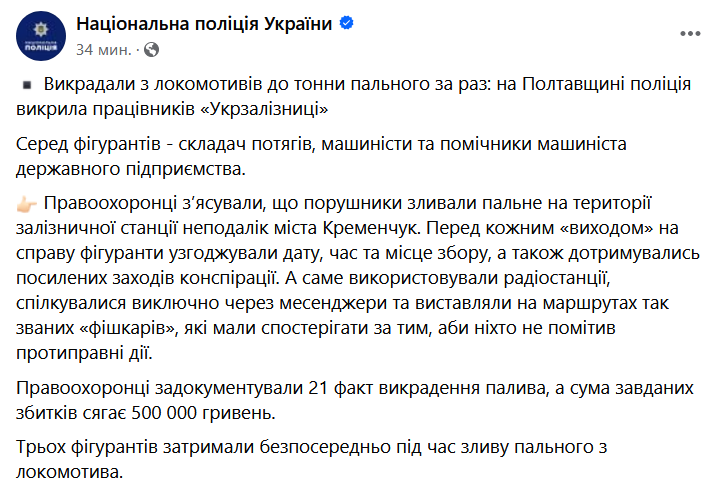 По данным правоохранителей, злоумышленники воровали из локомотивов до тонны топлива за раз на железнодорожной станции около Кременчуга. Задокументирован 21 такой эпизод, а задержали их прямо во время очередного слива.