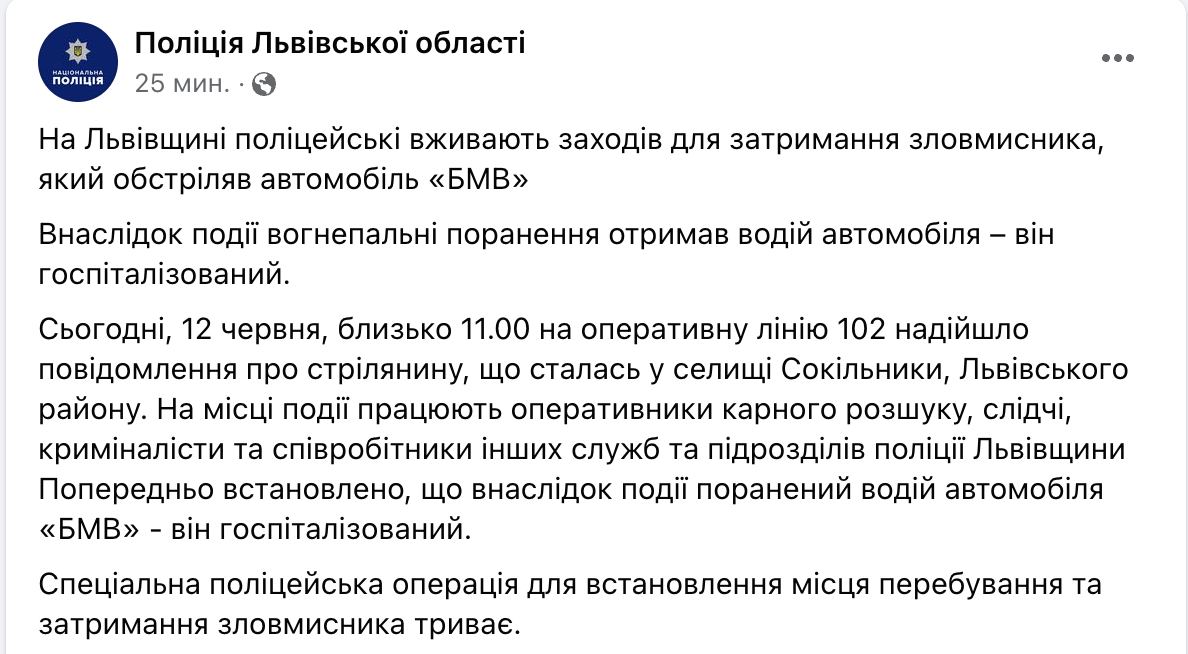"Сегодня, 12 июня, около 11:00 на оперативную линию 102 поступило сообщение о стрельбе, произошедшей в поселке Сокольники Львовского района. На месте происшествия работают оперативники уголовного розыска, следователи, криминалисты и сотрудники других служб и подразделений полиции Львовщины. Предварительно установлено, что в результате происшествия ранен водитель автомобиля BMW – он госпитализирован. Специальная полицейская операция для установления места нахождения и задержания злоумышленника продолжается", - сказано в публикации.