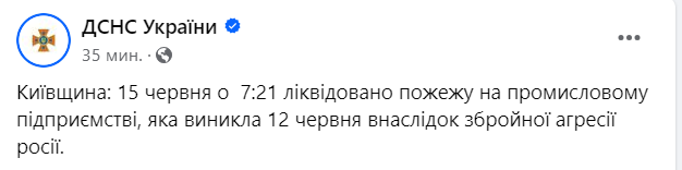 "Киевщина: 15 июня в 7:21 ликвидирован пожар на промышленном предприятии, возникший 12 июня в результате вооруженной агрессии россии" -  говорится в сообщении.