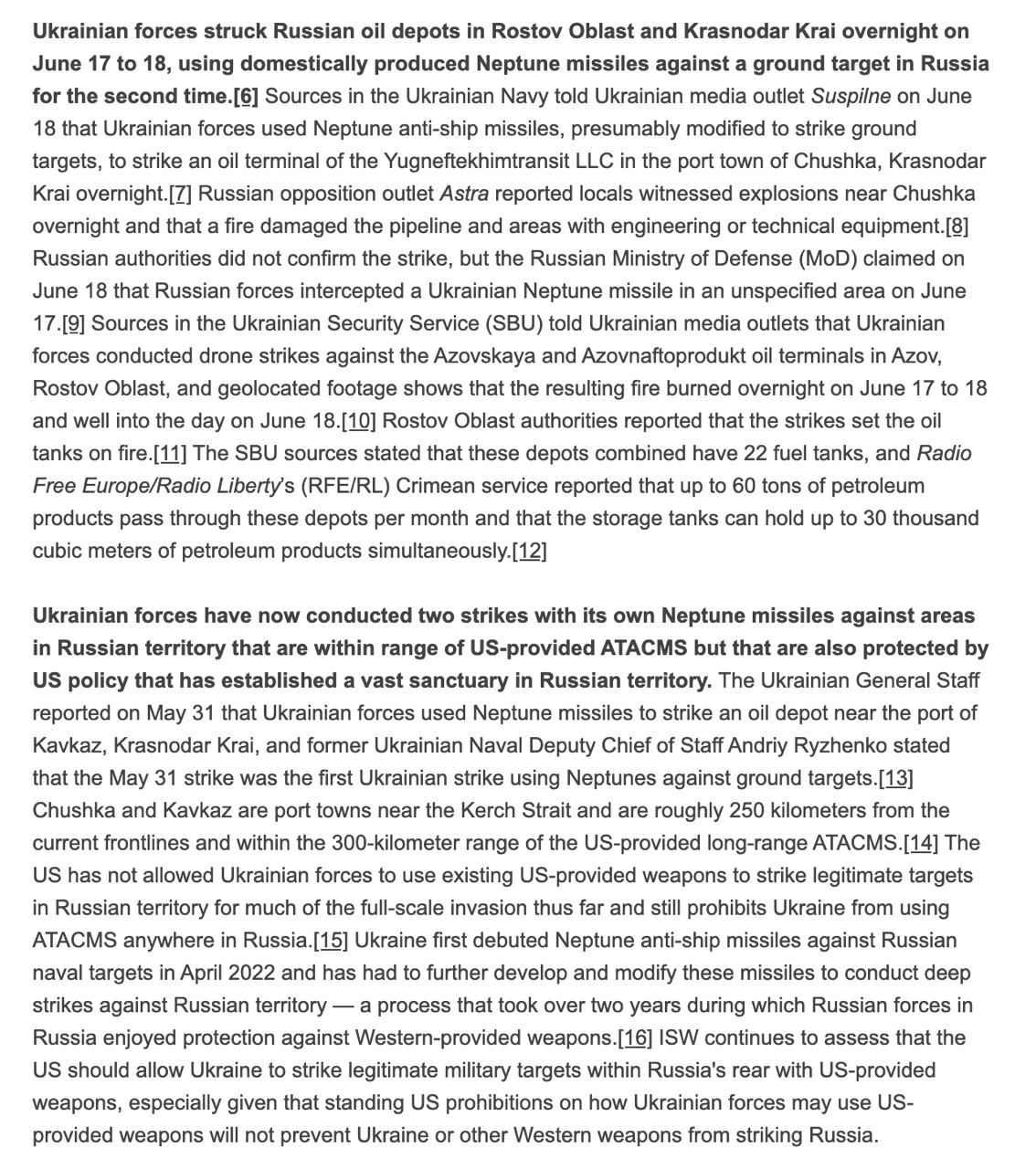 В ночь на 18 июня украинские ракеты "Нептун", модифицированные для поражения наземных целей, ударили по нефтяному терминалу "Югнефтехимтранзита" в портовом поселке Чушка Краснодарского края рядом с Керченским проливом.