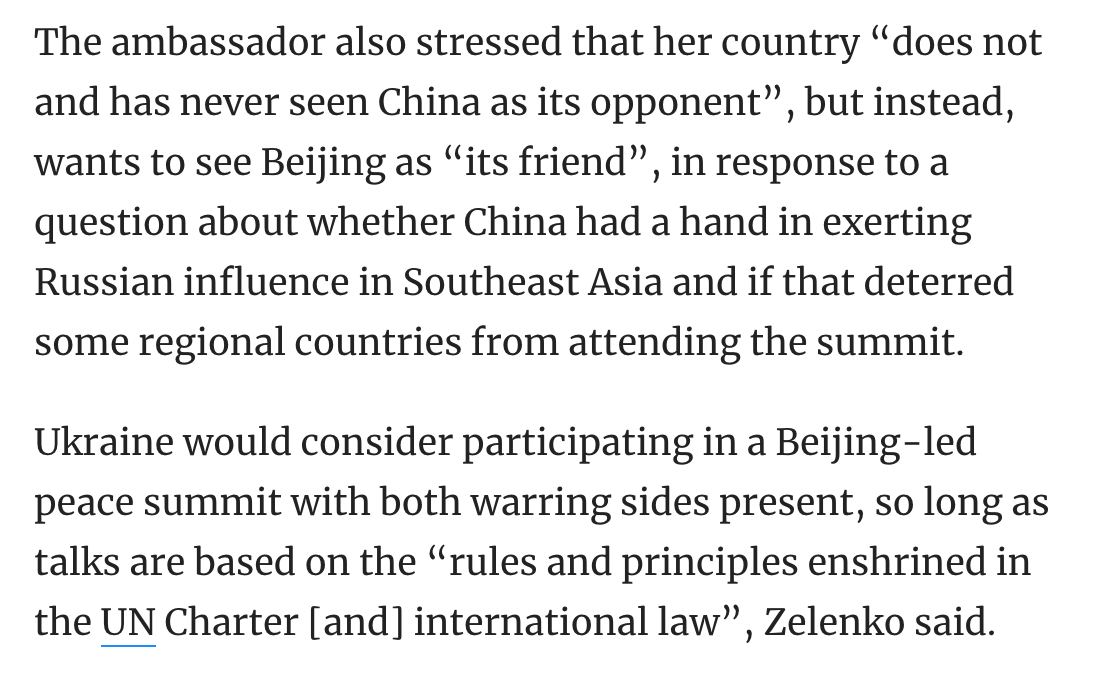 12:05 Украина допускает свое участие в китайском мирном саммите с участием РФ, заявила посол Украины в Сингапуре Екатерина Зеленко в комментарии South China Morning Post.