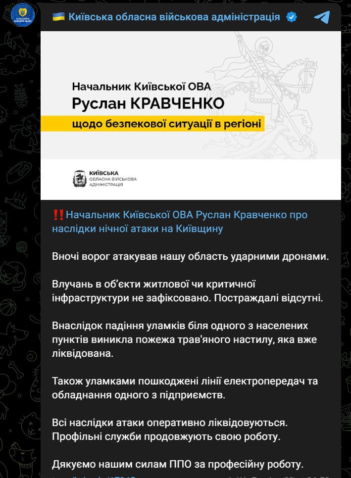 07:59 В Киевской области обломки дронов повредили оборудование одного из предприятий, заявляет ОВА. Также повреждены линии электропередач.