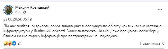 В ночь на 22 июня россияне нанесли массированный удар ракетами и беспилотниками по Украине. Взрывы прогремели в Луцке Волынской области, в Винницкой и Ивано-Франковской области, а также возле Стрыя Львовской области.