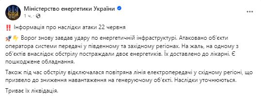 Минэнерго заявляет, что армия РФ нанесла удар по энергетической инфраструктуре. Атакованы объекты оператора системы передачи в южном и западном регионах. На одном из объектов в результате обстрела пострадали два энергетика, их госпитализировали.