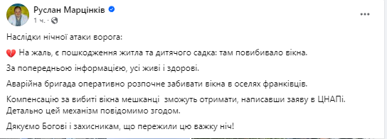 Также ночной российской атаке подвергся Ивано-Франковск. Мэр города Руслан Марцинкив сообщил, что есть повреждения жилья и детского сада: там выбило окна.