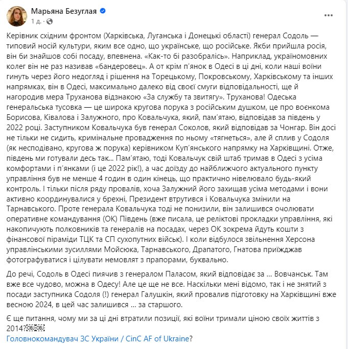 По информации Безуглой, "Содоль в Одессе пьянствовал с генералом Паласом, который отвечает за ... Волчанск".