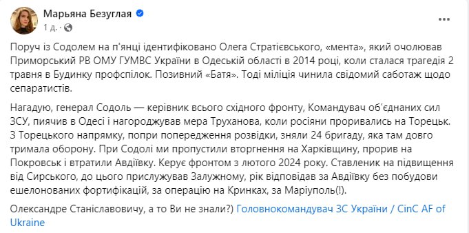 Посты Безуглой с обвинениями в адрес генерала были опубликованы день назад.
