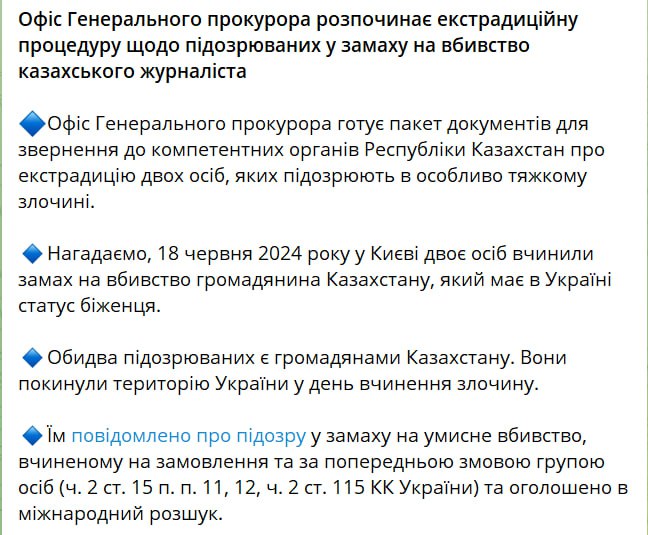 Украинское следствие заявило, что уже установило лиц, причастных к покушению. На сайте Офиса генпрокурора были опубликованы подозрения двум гражданам Казахстана - Алтаю Жаканбаеву и Мейраму Каратаеву. Последний является полицейским из Казахстана.