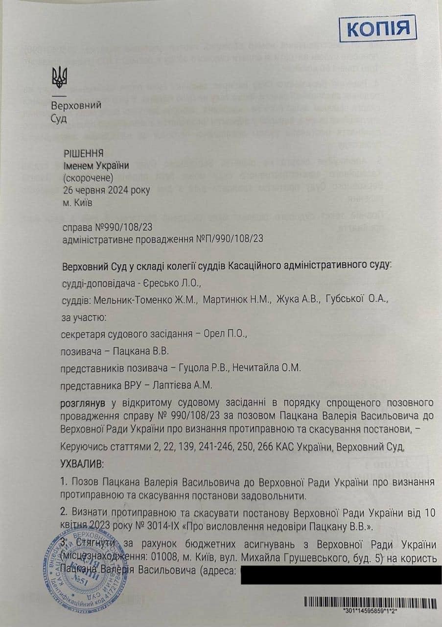 Валерий Пацкан заявляет, что Верховный суд признал незаконным его отставку с должности главы Счетной палаты. Суд отменил постановление Верховной Рады от 10 апреля 2023 года.