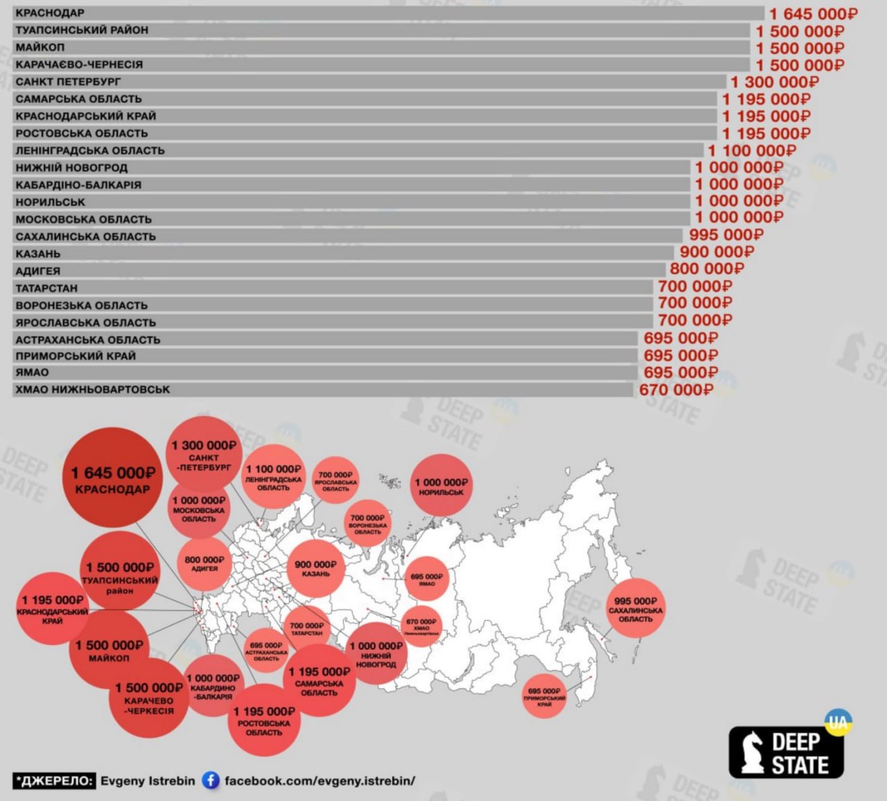 Такие цифры приводит украинский блогер Евгений Истребин, который исследует динамику этих выплат в разных регионах РФ.